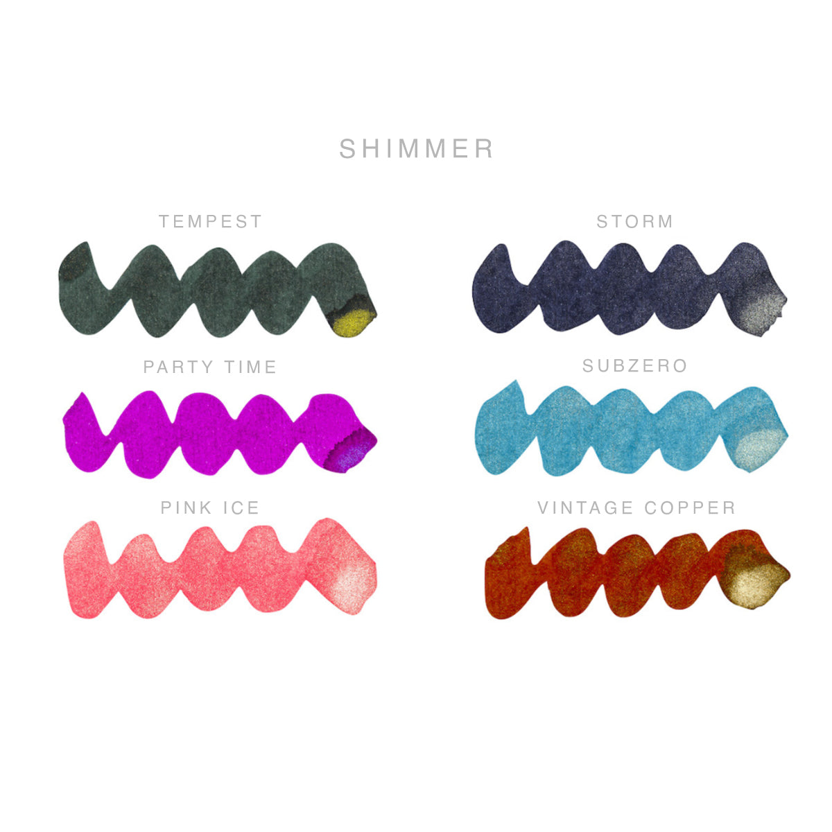 Shimmer Inks: Tempest, Storm, Party Time, Vintage Copper, Subzero, Pink Ice