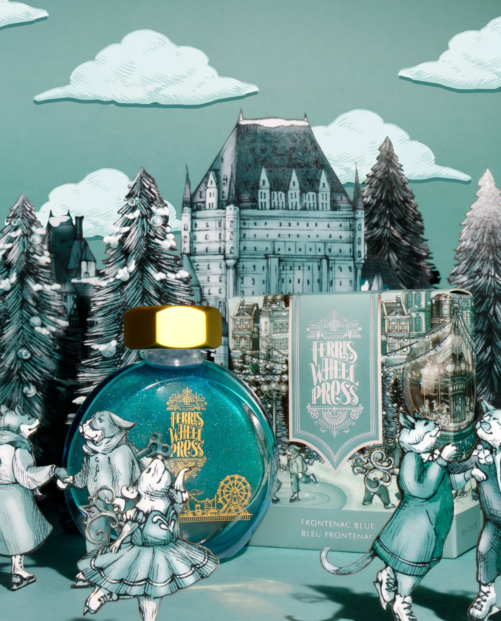 Frontenac Blue - Transported through the window of the treasured snow globe, Bearnice's thoughts drift back to the winters of childhood, when she and her beloved grandmother would go skating in the park and partake in whimsical winter activities. With a tender shake, a vivid scene conjures: a winter wonderland with a gleaming skating rink and a whimsical carousel, stirring memories of family and friends. Snowflakes within twirl like precious moments, mirroring the twinkling lights of a long-forgotten carnival. In the depths of this icy blue, tales of warmth, kinship, and enchantment beckon, just as they did in Bearnice's cherished recollections.