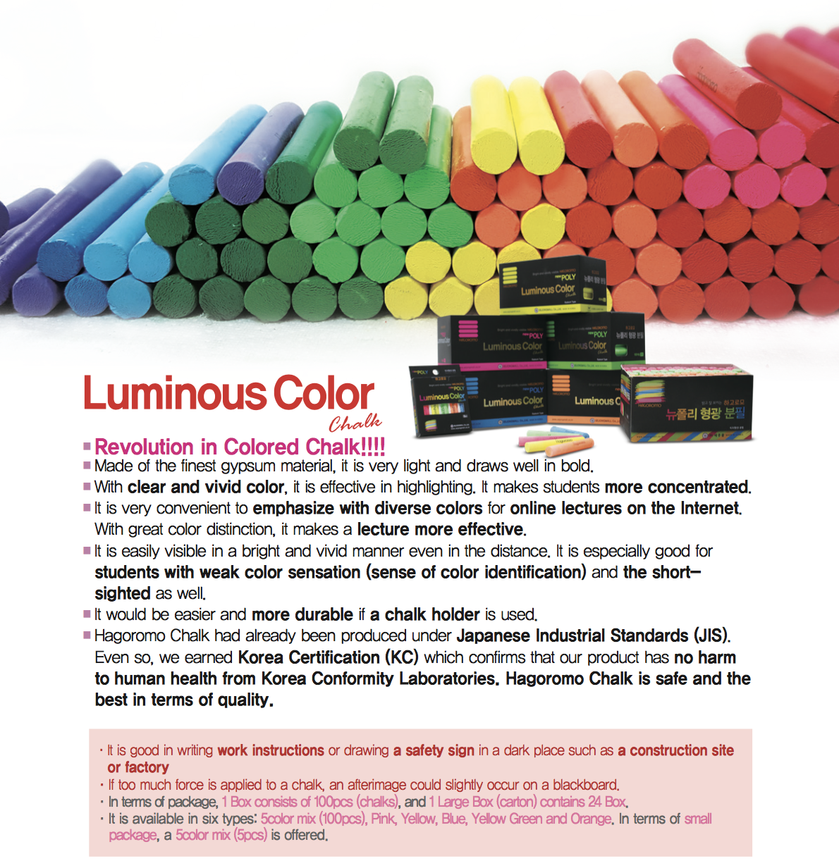 Hagoromo Fulltouch chalk is considered to be the Rolls Royce of chalks. It is preferred by mathematicians for its solid feel, dust-free qualities. Hagoromo chalks come from a long tradition of Japanese craftsmanship and is made with precision in South Korea. The luminous chalk uses the most advanced technology for vivid colors. It is perfect for use in dark places like construction sites or factories. Each box comes with 5 chalks (1 pc each of Pink, Yellow, Blue, Yellow Green, Orange).