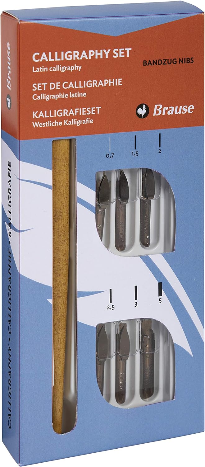 Brause has been manufacturing steel nibs in Germany since 1850 and is a favorite of professional and student calligraphers alike. This set includes 6 of their most popular nibs and a natural wood nib holder. A great gift for any budding or advanced calligrapher!