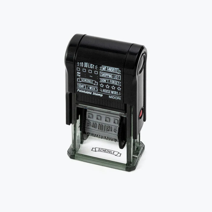 This fun rotating stamp by Midori allows you to choose from several designs and patterns that come with each stamp. The rotating stamp comes with an ink pad to be installed into the stamp before beginning to use it. Lock buttons on the side of the stamp allow you to lock the stamp into place when changing out the ink pad and when changing between designs to avoid mess.