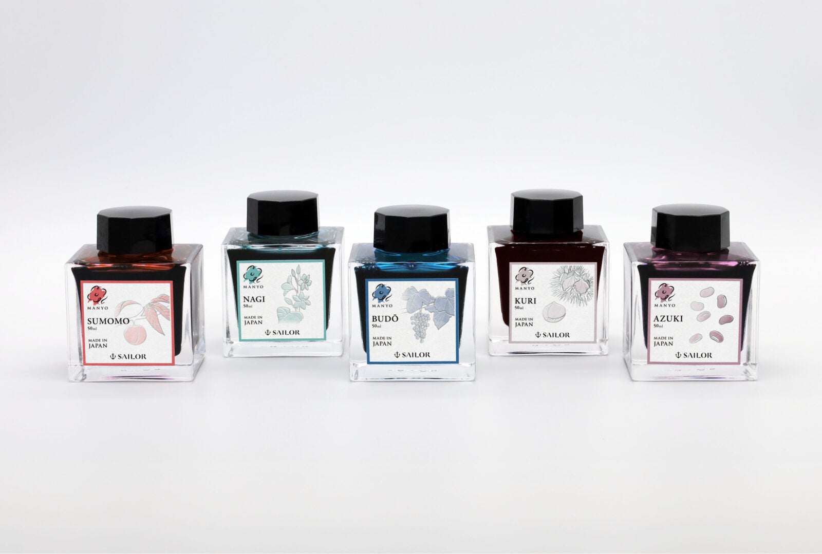 Sailor'sManyo("Ten Thousand Leaves") line of fountain pen inks features beautiful and unique colors inspired by the plants and flowers of Japan. The name is a reference to the "Manyosyu", the oldest and most revered anthology of Japan's poetic compilations. 4516 poems wrote by every class of person ranging, from Emperors to merchants and farmers.Manyois an abbreviation of "Manyosyu" and its meaning indicates people of all ranks.