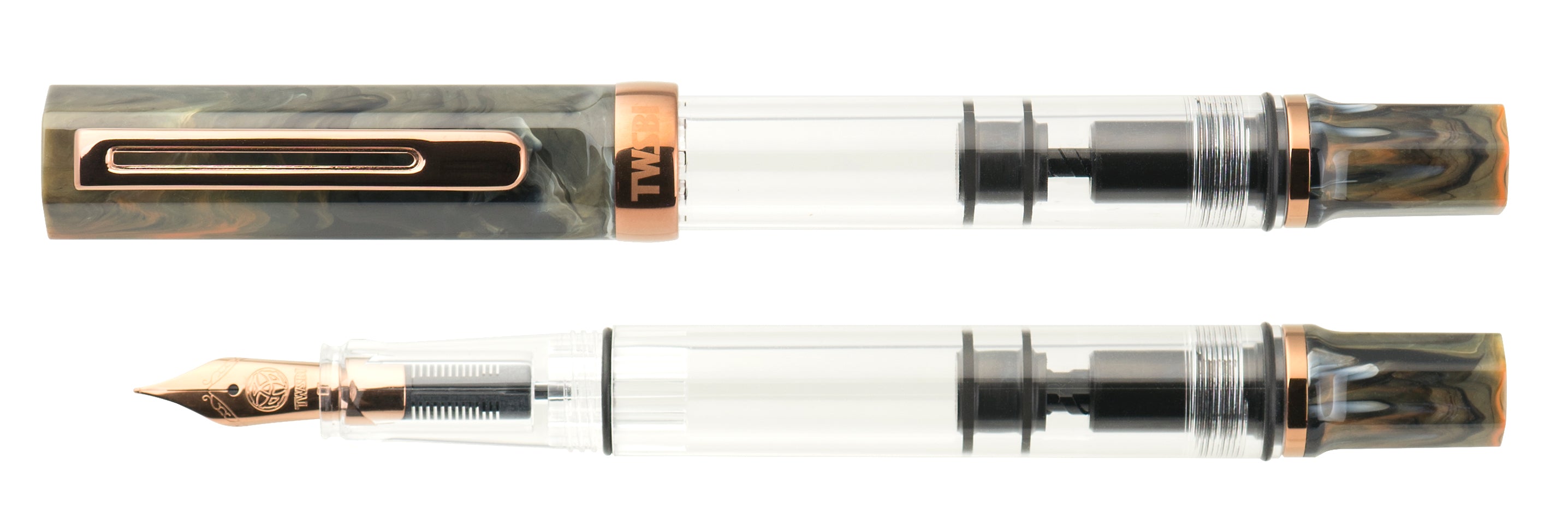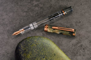 Inspired by the rich, earthy tones of natural stone, the TWSBI ECO Serpentine edition pairs a swirling marbled cap with warm bronze detailing, creating a truly eye-catching writing instrument. The clear demonstrator body allows a full view of the inner workings and ink level, celebrating the mechanical beauty TWSBI is known for. The hexagonal cap, finished in a deep blend of forest greens, ambers, and smoky greys, is complemented by a gleaming bronze clip and cap ring. A matching bronze stainless steel nib offers a smooth, consistent writing experience with just the right amount of flex and feedback.